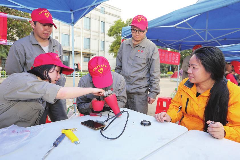 “小伙子,這個電烤箱壞了,你看能修好嗎?”“沒問題,我?guī)湍愣ā!薄斑@些相片可以幫我過塑嗎?”“可以,馬上就給您過塑”……上午9時許,活動剛剛開始,廣場上就聚集了許多群眾,面對群眾的每一個困難或疑問,志愿者都熱情解答,并一一動手解決。