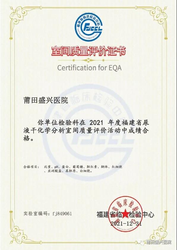 (下面圖片為2021年參加福建省常規(guī)化學(xué)室間質(zhì)量評(píng)價(jià)獲得的證書)